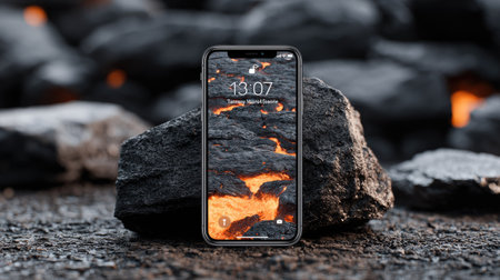 Smartphone with burning fire on asphalt