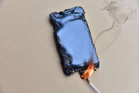Mobile phone caught fire and melted on the table close-up. High quality photo