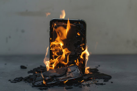 A cell phone engulfed in flames rests ominously on a table, emanating smoke and heat in a dramatic display of destruction.