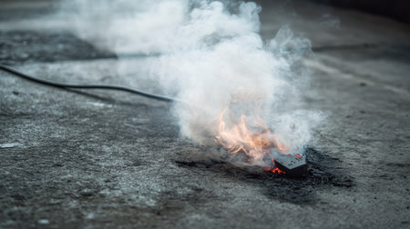 Smoke rising from a partially burnt electrical cord lying on a concrete floor