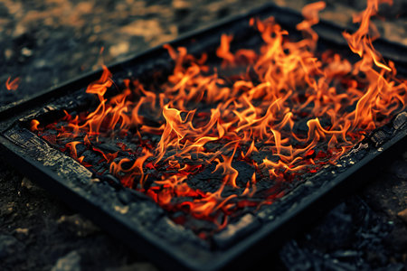 Old photo frame on the background of burning fire. Close up.