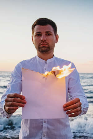 Man holding white burning paper at the background of the sea.