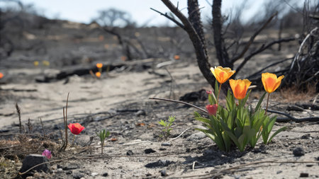 Tulip Flowers Blooming in Springtime on a burnt Out Landscape