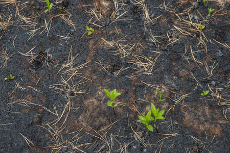 small sprouts grow on the scorched earth after a fire. environmental disaster. Ecosystem restoration