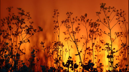 A striking silhouette of wildflowers against a rich sunset horizon. This captivating image captures the tranquility and beauty of nature, perfect for artistic projects.