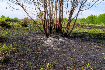 burnt bush and surrounding vegetation damaged by spring grass burning and field fires