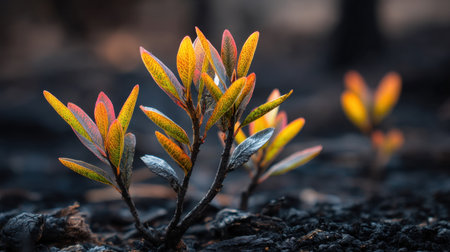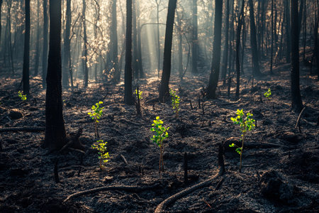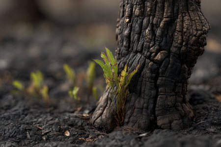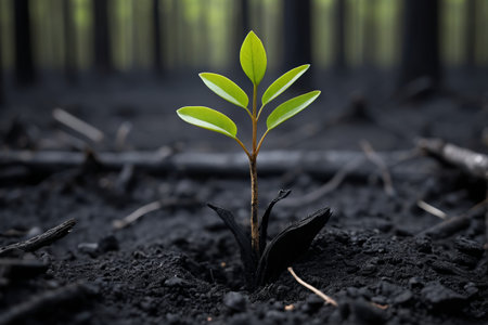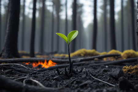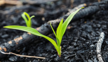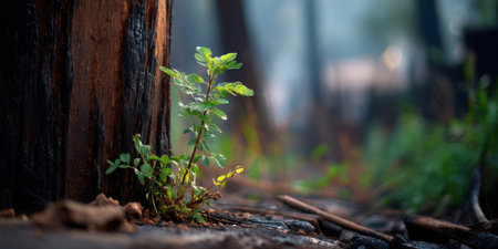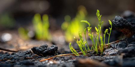 Young green shoots sprouting from burnt soil after forest fire, symbolizing renewal and hope in nature