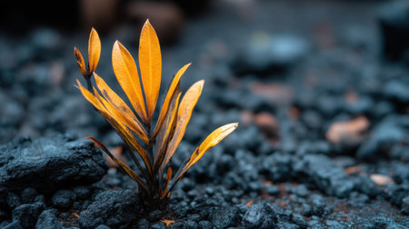 A beautiful close-up of a resilient plant with vibrant leaves emerging from volcanic soil, highlighting nature's beauty and contrast in a rocky environment.