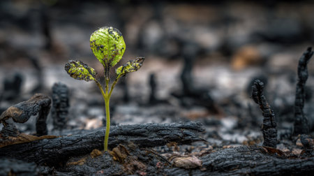 A vibrant green sprout pushes through blackened soil, symbolizing resilience and hope after a devastating wildfire, showcasing nature's recovery.