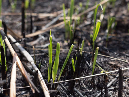 Shoots of fresh green grass on the site of burnt grass after a forest fire