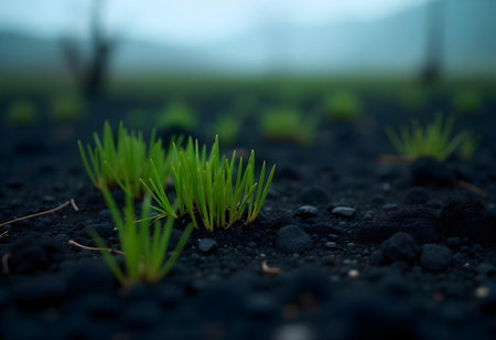 Shoots of green grass are growing on the black volcanic soil, a sign of rebirth after a volcanic eruption