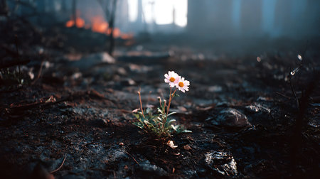A single green plant grows in a patch of scorched earth after a forest fire, symbolizing hope and new beginnings, reminding us that even in darkness, hope remains for the future.