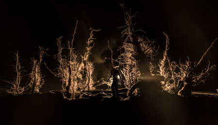 Silhouette of a person standing in the dark forest. Horror halloween concept. strange silhouette in a dark spooky forest at night