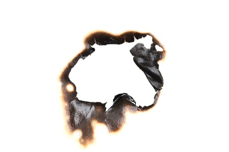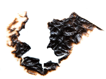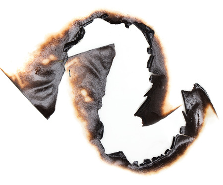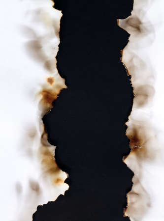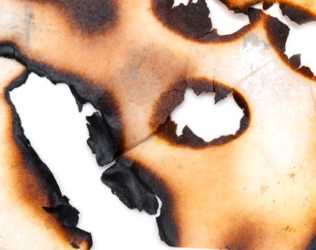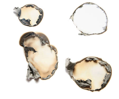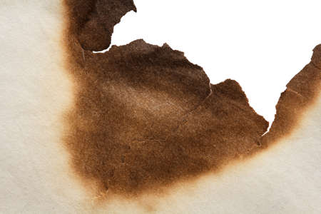 Fire burned hole white paper background texture. Paper burn mark stain.