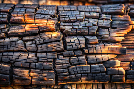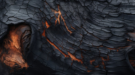 A detailed examination of burned wood reveals unique textures and patterns created through charring and heat exposure.