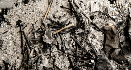 A grunge texture background with charred wood, soot, and ash, evoking a sense of destruction and abandonment.