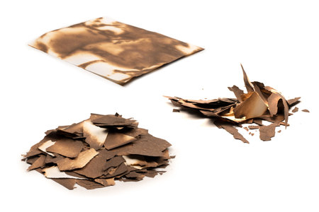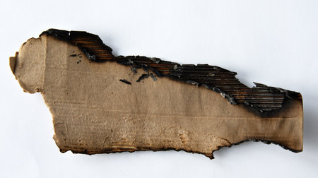A close-up shot captures the charred and blackened edges of a stack of important documents.