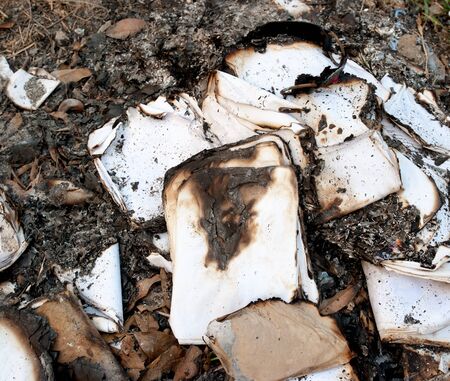 Burnt trash. Remains of burnt garbage. Household waste. Waste disposal. Garbage in the barrel. Disposal of waste in a garbage can.