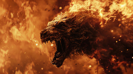 A fierce lion breathing fire, showcasing power and intensity in dramatic scene. vibrant flames contrast with lion majestic mane, creating captivating visual