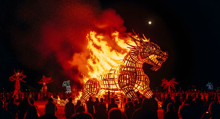 A massive, intricate wooden effigy of a dragon is engulfed in fire during a night festival, surrounded by a crowd of people. The dramatic scene, with smoke and embers rising against a dark sky with a moon, captures a moment of celebration, art, and tradition.