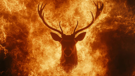 head of beautiful deer with large branched antlers on fire background. abstract concept of heat, climate change and destruction of animal species.