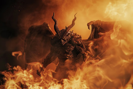 Scary sinister devil is in hell with dramatic bright fire lighting, abstract vivid composition consists of fictional unreal fantastic vision on background for diverse creative work