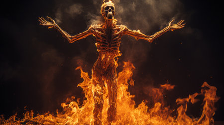 a hyper-detailed rendering of a skeletal statue standing amidst flames, created in cinema4d. this realistic sculpture showcases precisionism influence with its energetic expressions and dynamic, action-packed scenes. the angelcore aesthetic is evident in the angelic figure, capturing a sense of ethereal beauty and power. ai generated