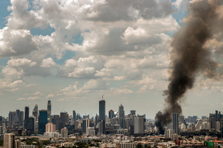Bangkok, Thailand - 21 Jun, 2022 : Plume of black smoke clouds from burnt building on fire at community area in the bangkok city. Fire disaster accident, No focus, specifically.
