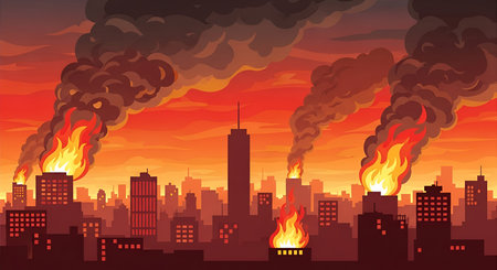 An illustrative depiction of a city skyline engulfed in flames. Tall buildings are silhouetted against a dramatic orange and red sky, with thick plumes of dark smoke rising from multiple structures. Bright orange and yellow flames are visible, indicating widespread destruction and chaos.