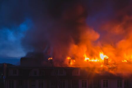 Building in fire, burning fire flame with smoke on the apartment house roof at night in the city.