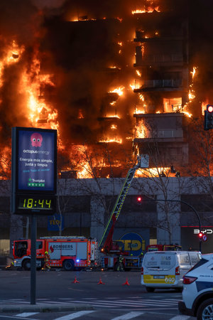 Valencia, Spain - February 22, 2024: Group of firefighters escaping from a large residential building fire through the ladder of the truck in the city of Valencia in great danger