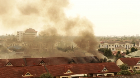 Black smoke from the conflagration rises up and goes over the misty roofs of city houses in the early morning against the backdrop of the cityscape.