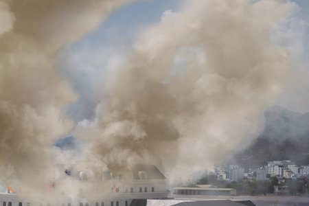 Dramatic fire erupts in high rise building, smoke billowing from top floor window in stunning detail