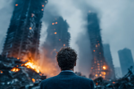 A man gazes in horror as towering glass buildings erupt in flames, debris falling amidst chaos in a bustling city under catastrophic stress.