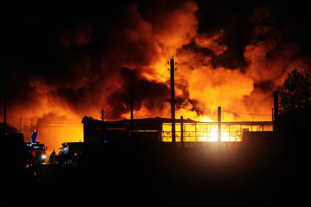 Intense flames consume an industrial facility as firefighters work to control the fire at night.