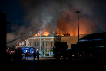 Rybinsk, Russia -31 July 2018 : Large night fire, burning modern building, smoke clouds, flames, people on the street watching the fire