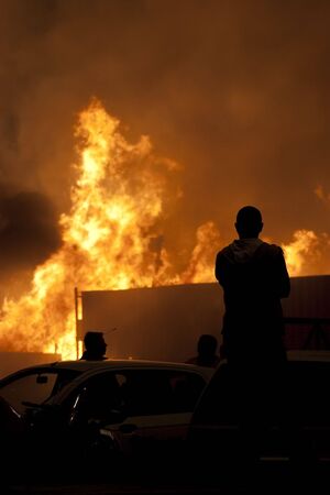 Massive large blaze fire in the city, brick factory building on fire, hell major fire explosion flame blast, with firefighters team firemen on duty, arson, burning house destruction