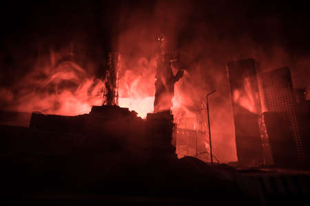 Empty street of burnt up city, flames on the ground and blasts with smoke in the distance. Apocalyptic view of city downtown as disaster film poster concept. Night scene. City destroyed by war.