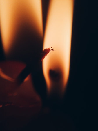 Light candle with hot fire burning brightly in blur dark blackgroung. Macro!!