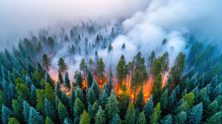 An aerial view presents a dramatic scene of a forest fire, with dense smoke swirling above lush greenery, capturing the urgent beauty and ecological impact of wildfire.