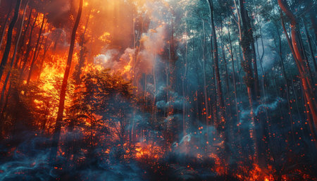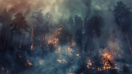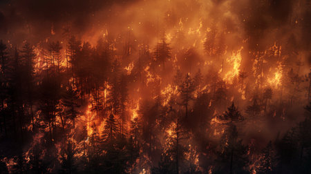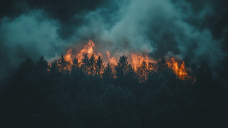 A dramatic forest fire scene showcases intense flames and heavy smoke engulfing trees, highlighting the destructive power of nature and environmental crises.