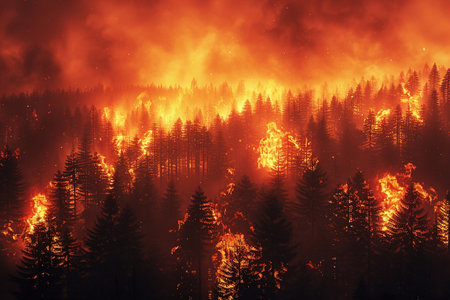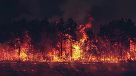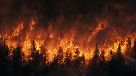 Intense forest fire scene showcasing vibrant flames consuming trees against a dark night sky, emphasizing the destructive power of nature and urgent need for conservation efforts.