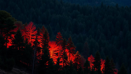 Forest fire at night with glowing red horizon and silhouette of pine trees creating dramatic and intense atmosphere