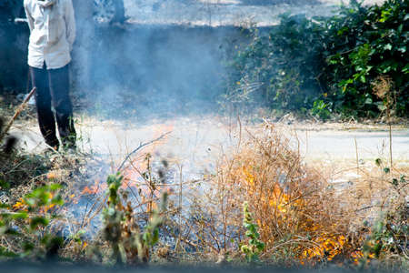 shot of crops thrash garbage being burnt on the side of a road and causing pollution with smoke and dust in the air of delhi jaipur and more reducing the air quality