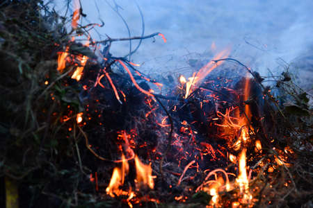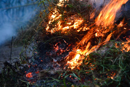 Burning old dry grass. Tongues red flame and burning dry yellowed grass in smoke.