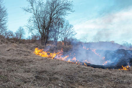 On a hot summer day, dry grass is burning on the field. Burning field with dry grass.
