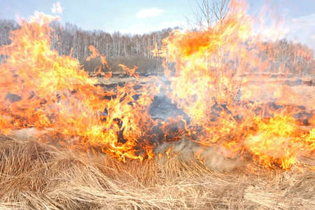 Fire in field. Burning dry grass after winter near forest. Autumn landscape and grassfire, natural disaster