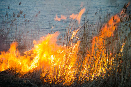 Burning reeds on the shore of the lake in the spring