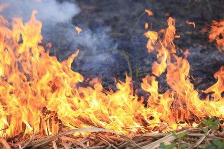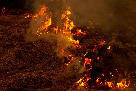 Fire and burning dry grass make a flame with smoke it danger for agriculture and environment and cause conflagration