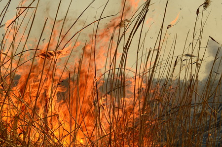 Close up shot of burning reeds. Nature fire landscape. Devastation of wildlife, human influence on planet. Air pollution, hot and dry climate, environment, Earth saving concept